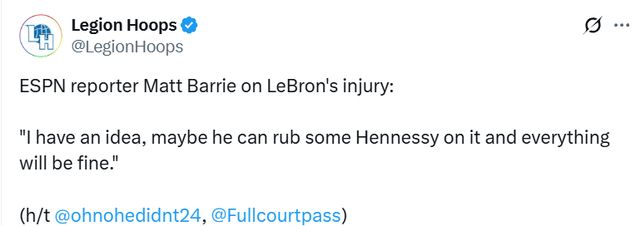 40岁的詹姆斯已缺席湖人队前两场季前赛,且尚未参加一次完整的训练。湖人队主教练雷迪克此前将其伤情描述为“臀部神经刺激”。ESPN记者Matt Barrie在报道时调侃了老詹: “我倒有个主意,或许他往伤处抹点轩尼诗,一切就都好了。”此前,詹姆斯以“决定2”的方式宣布与轩尼诗推出联名干邑,遭到不少嘲讽。
