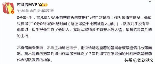 媒体人付政浩发文点评说道:0分0出手,曾凡博NBA季前赛首秀的数据栏只有1次抢断!作为东道主球员,他却只获得了10分06秒的出场时间(这还得益于比赛被拖入加时),队友几乎没有给他传球,似乎把他当作了透明人。篮网队将帅多少有些不通人情,毕竟这是曾凡博的主场。