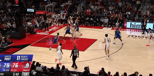 第三节开拓者卡莱布-乐福拿下6分,勇士斯蒂芬-库里拿下13分,第三节结束开拓者87-91落后勇士