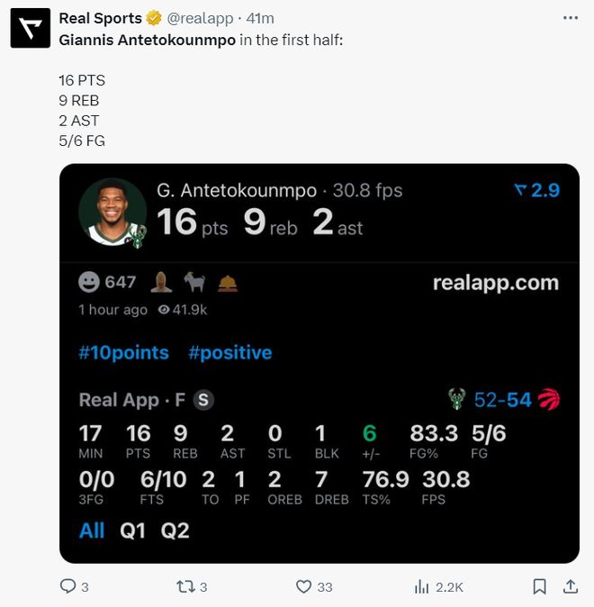 第二节扬尼斯只打了7分钟,2中1拿到4分4篮板1助攻,半场17分钟,6中5拿到16分9篮板2助攻1盖帽,真实命中率高达76.9%。