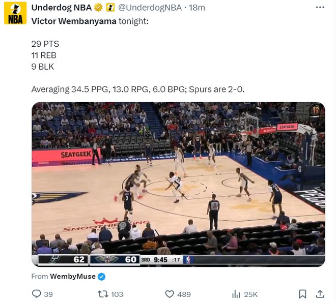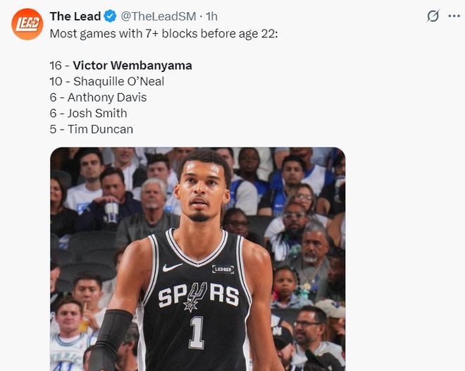 新赛季两场比赛,文班亚马场均34.5分13篮板6盖帽,马刺2胜0负。