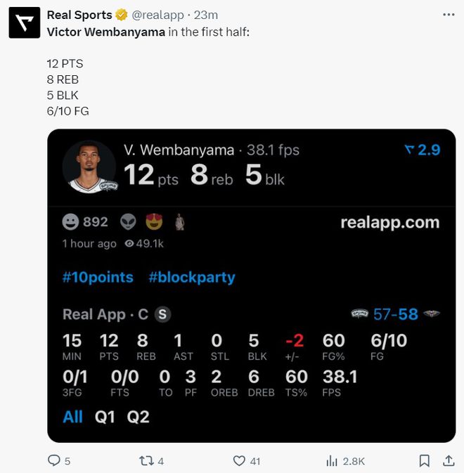 次节文班亚马更多的打到内线,这应该是教练的战术,防守端文班亚马依旧强势,鹈鹕锋线与内线尺度不足各种送帽,单节文班亚马5中4拿到8分5篮板1助攻3盖帽,上半场打完文班亚马已经拿到12分8篮板5盖帽的数据。