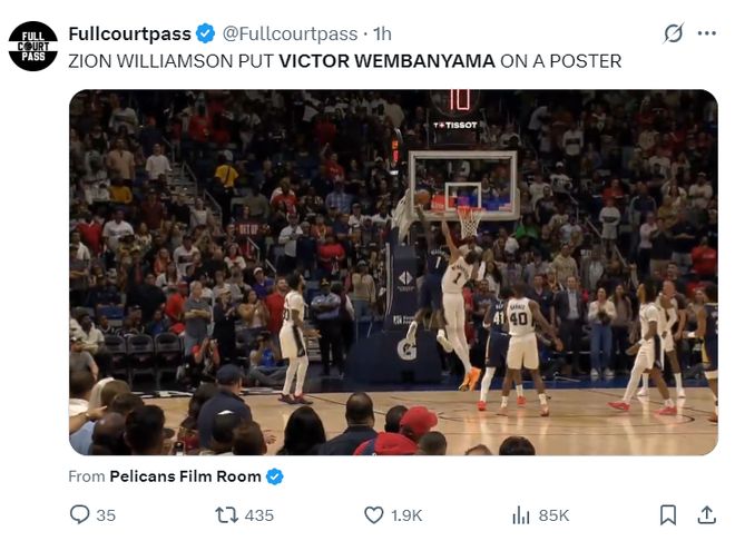 文班亚马在上一场对阵独行侠的比赛中21中15拿到40分15篮板1助攻1抢断3盖帽,文班亚马经过八个月的康复身体状态非常的好,此役文班亚马将直面身体对抗极强的矮个PF锡安-威廉森,胖虎隔扣了文班亚马一球全场欢呼,但首节文班5中2+三分1中0拿4分3篮板2盖帽。