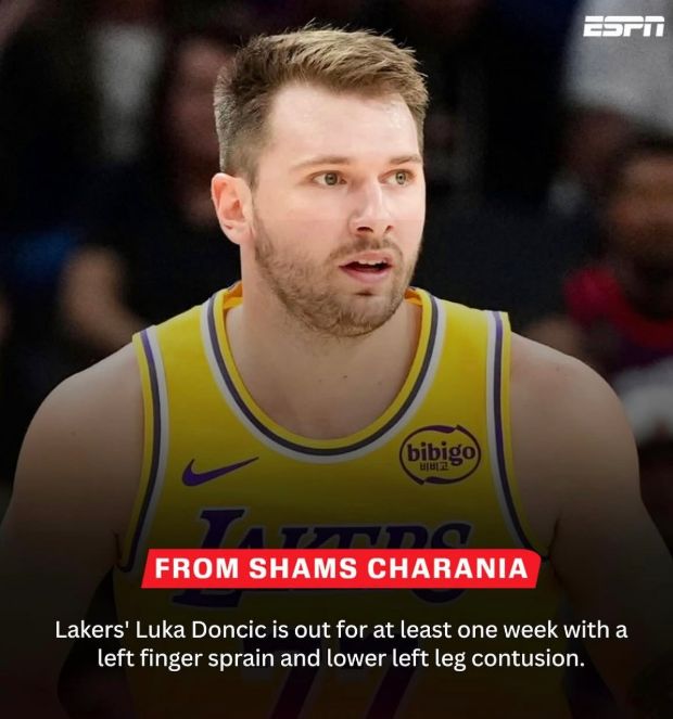 爆料王Shams报道:东契奇因左手指扭伤和左小腿挫伤,至少休战一周时间。