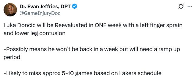 尽管湖人队最初将此次伤病定性为“短期伤停”,但医学专家认为东契奇的缺阵时间可能不止几场比赛。伤病专家Jeffries表示,东契奇在重返赛场前,很可能需要额外的恢复与状态调整时间。