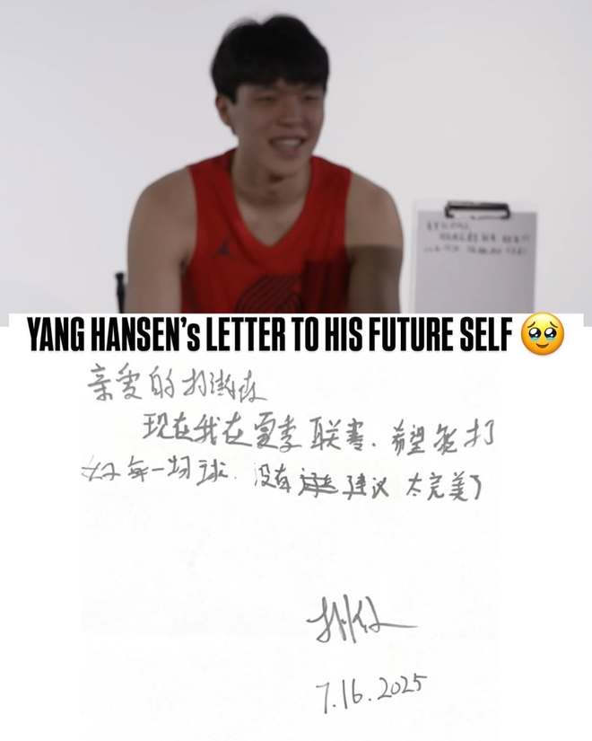 赛前,NBA官方晒出了杨瀚森在夏季联赛期间给未来的自己写一封信,内容为: