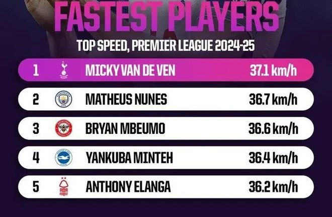 另一项数据表明,姆贝莫不仅肯跑、能跑,而且还跑得很快!他的冲刺极速达到了36.6公里/小时,在本赛季的英超仅次于热刺后卫范德文和曼城中场马特乌斯·努内斯。曼联熟悉的瑞典快马埃兰加,在这份排行榜上也落后于姆贝莫。