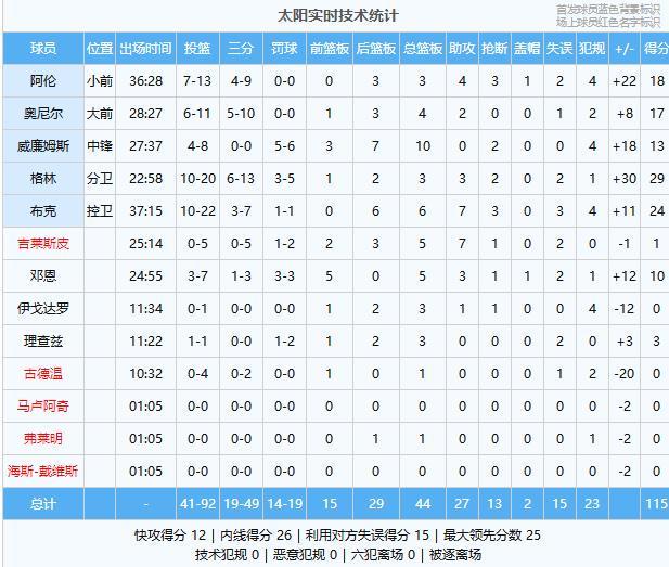 太阳:格林29分3板3助2断、布克24分6板7助3断、阿伦18分3板4助3断、奥尼尔17分4板2助、威廉姆斯13分10板2断、邓恩10分5板3助、理查兹3分3板