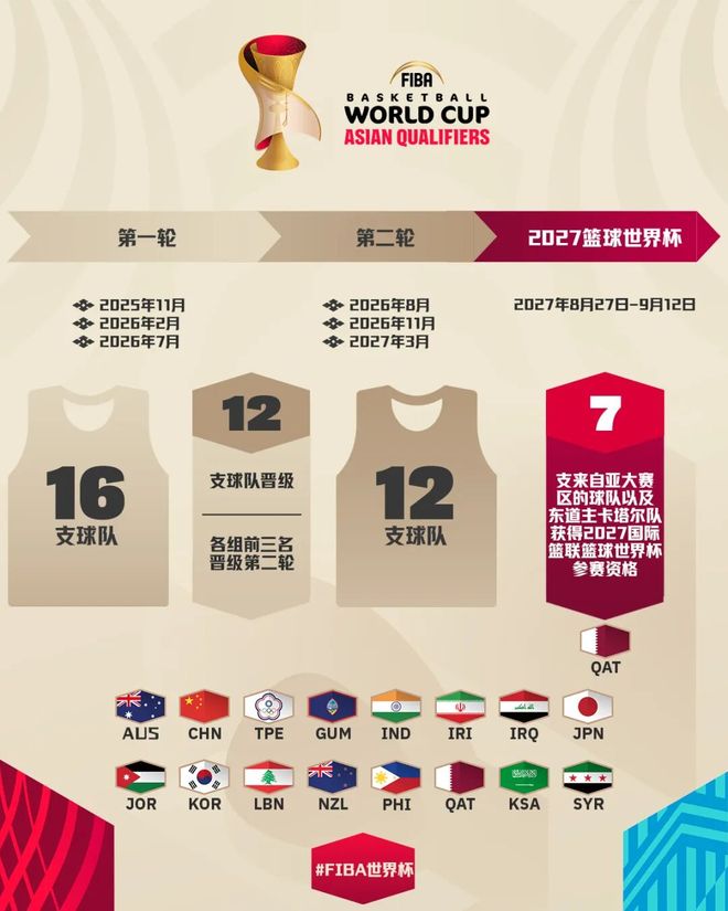 2027FIBA世界杯亚大区预选赛即将打响,共有16支来自亚洲与大洋洲的国家及地区代表队参赛,争夺7个晋级名额。先了解下赛制,此次预选赛设有六个窗口期,分两轮进行: