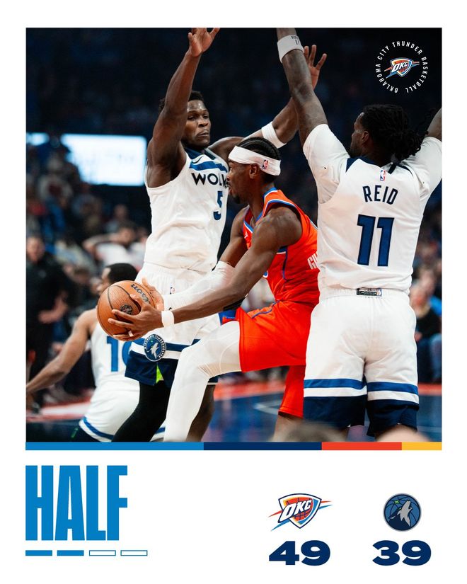 乔罚球命中开启第二节,两队之后各打成几次进攻,爱德华兹和迪林哈姆拿下4分,森林狼队追至26-32。威廉姆斯两罚还击,森林狼队又追5分迫近。亚历山大接管进攻,一人连拿8分帮助球队再次领先两位数。香农连得5分试图追分,亚历山大保持手感,左翼命中三分,接着又罚中两球,半场结束时雷霆队以49-39领先10分。