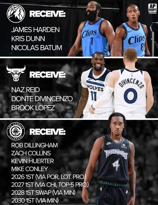 森林狼得到哈登,邓恩和巴图姆,公牛获得里德,迪文琴佐和洛佩兹,快船获得蒂林厄姆,柯林斯,赫尔特,康利,外加26年和27年首轮,还有28年首轮互换和30年首轮!