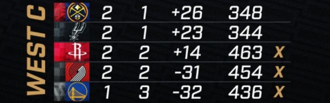 西部C组:掘金和马刺正面交手,赢球的小组第1晋级,输球的将出局,C组确定之后有1支晋级的球队。