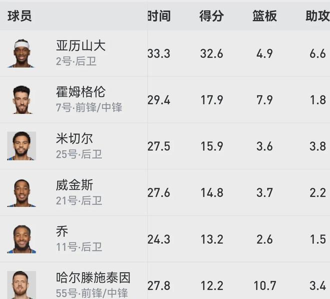 其实雷霆最可怕的地方不在于亚历山大一个人,而是整体实力,本赛季至今尽管除了他之外就无人再场均得分20+,但有五人场均得分上双,其中切特场均17.9分7.9板1.8助1.5帽,场均出战时间不到30分钟。